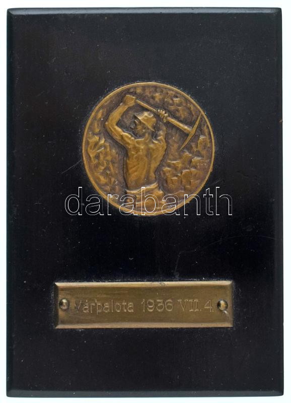 1936. Bányász emlékérem, fa hasábon "Várpalota 1936 VII 4" táblácskával. A városban ezen a napon került sor a bányászok gyűjtéséből épített uszoda felavatására. T:AU,XF