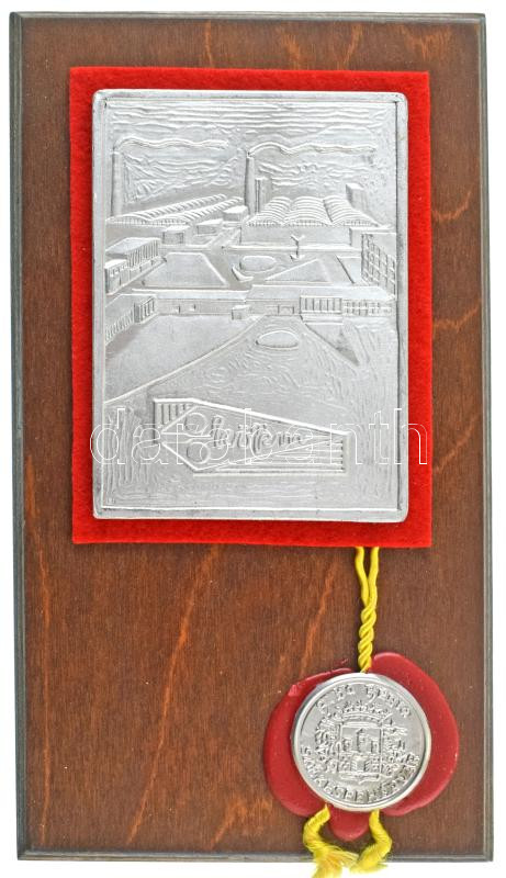 Beschreibung: DN (~1980) Székesfehérvári Könnyűfémmű "köfém / Alba Regia - Székesfehérvár " egyoldalas Al emlékplakett fa talapzaton, Székesfehérvár címerét utánzó műanyag viaszpecséttel (plakett: 80x110mm ; talapzat: 120x225mm) T:XF