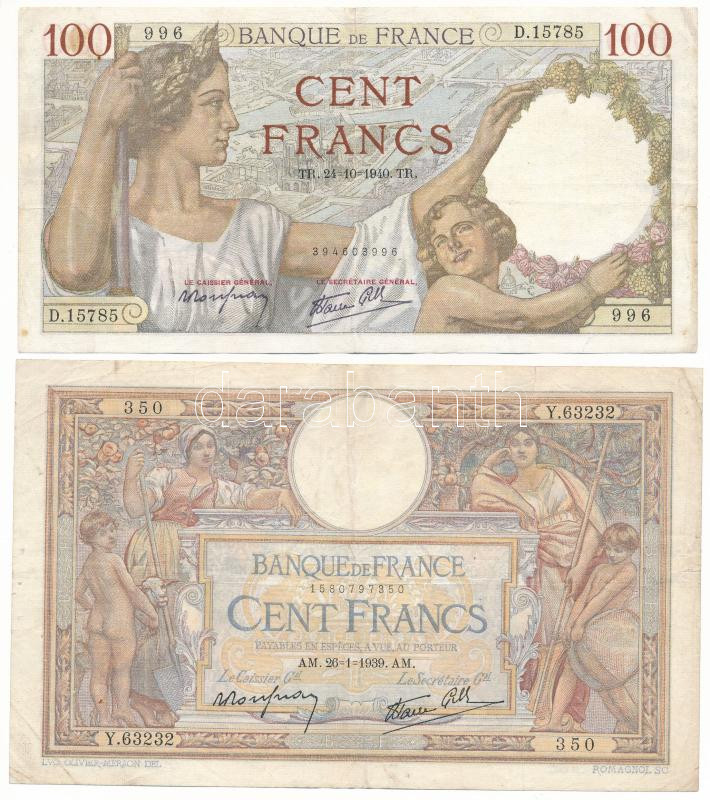 Beschreibung: Franciaország 1939. 100Fr "Luc Olivier Merson" + 1940. 100Fr T:F, pici szakadás