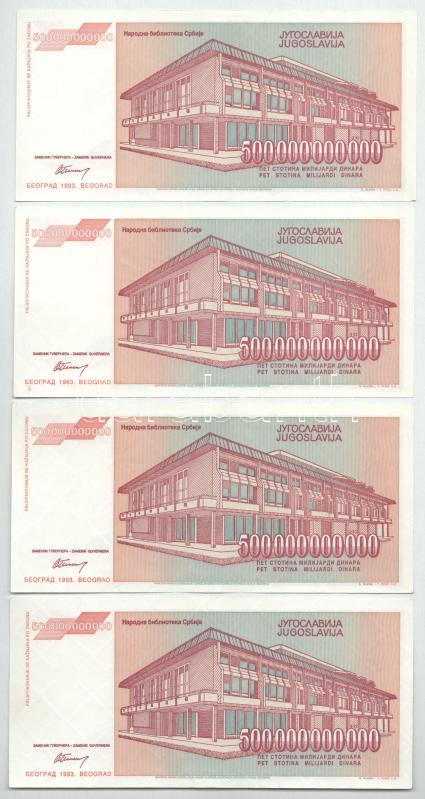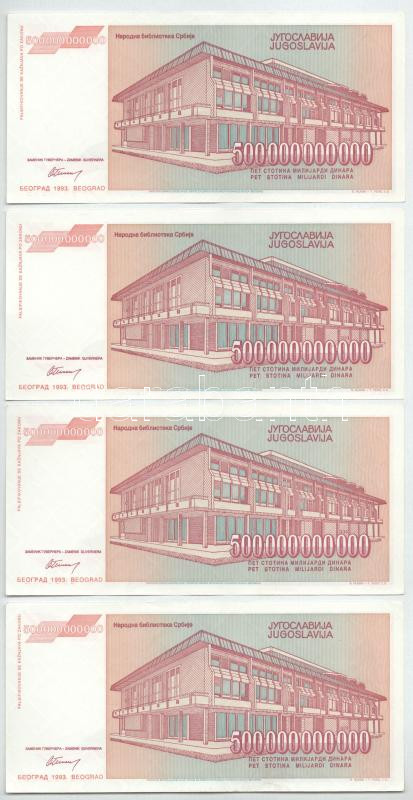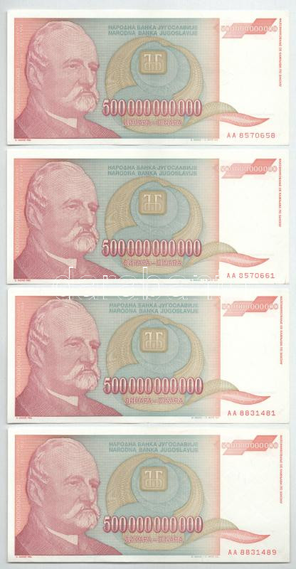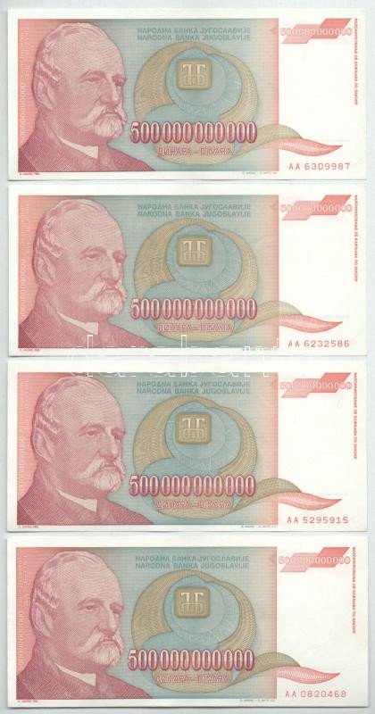 Jugoszlávia 1993. 500.000.000.000D (8x), ebből 4x közeli sorszámok két részletben: "AA 8570658 + AA 8570661" + "AA 8831481 + AA 8831489" T:AU,XF