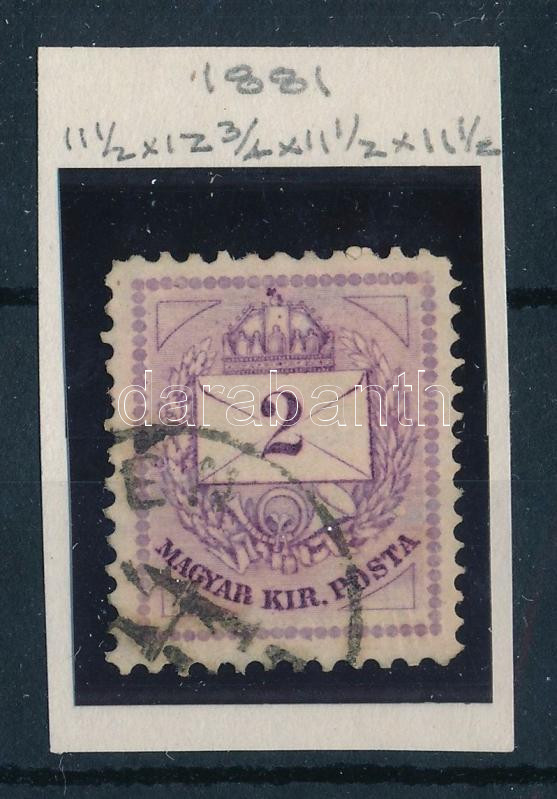 1881 Színesszámú 2kr 11 1/2 : 12 3/4 : 11 1/2 : 11 1/2 fogazással https://www.darabanth.com/de/508-Fernauktion/508.0/Philatelie-und-Postgeschichte-Ungarn/Ausgaben-1874-1899~32/1881-Szinesszamu-2kr-11-12-3Cstrong3E12-343Cstrong3E-11-12-11-12-fogazassal~II3432470