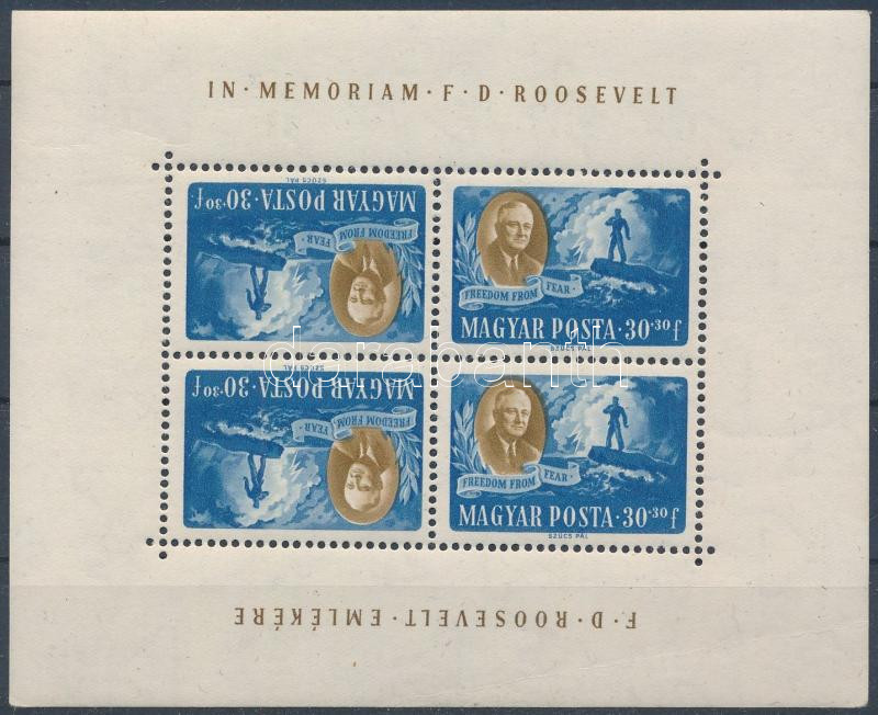 1947 Roosevelt 30f(+30f) fordított állású kisív (saroktörés / corner f... https://www.darabanth.com/de/508-Fernauktion/508.0/Philatelie-und-Postgeschichte-Ungarn/Ausgaben-1946-1956~50/1947-Roosevelt-30fplus30f-forditott-allasu-kisiv-saroktores-corner-fold~II3440007