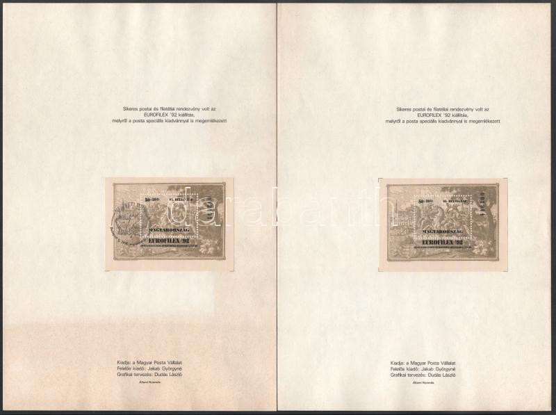 1992 Bélyegnap - Eurofilex pecsételt + postatiszta ajándék blokk emlék... https://www.darabanth.com/de/508-Fernauktion/508.0/Philatelie-und-Postgeschichte-Ungarn/Ausgaben-1990-1999~55/1992-Belyegnap-Eurofilex-pecsetelt-plus-postatiszta-ajandek-blokk-emleklapon-16000~II3441639