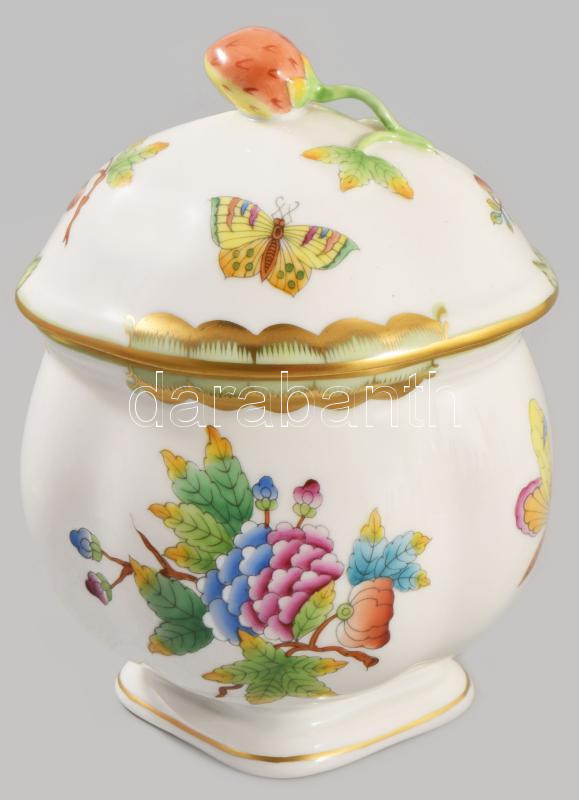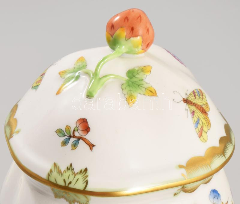 Beschreibung: Herendi Viktória mintás fedeles edény eperfogóval. Jelzett, kézzel festett, hibátlan, 11x11x15 cm