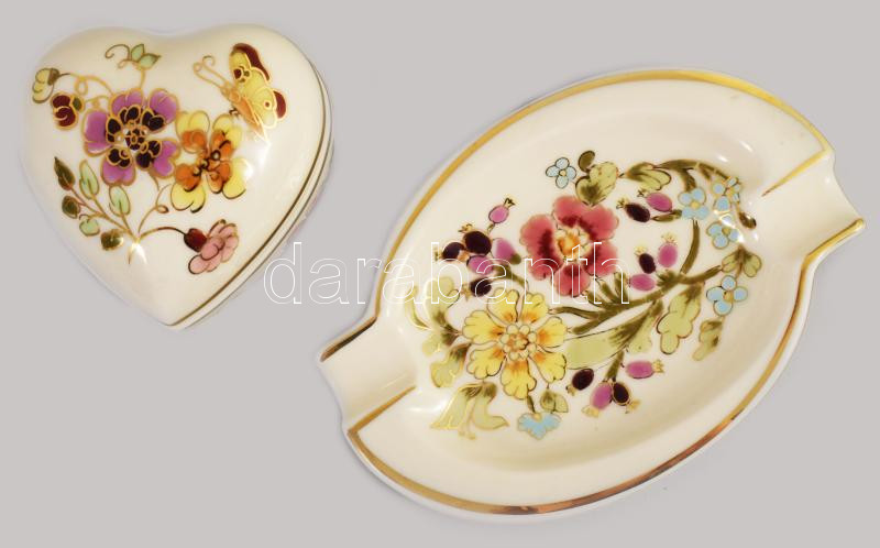 Beschreibung: Zsolnay pillangó mintás szív alakú bonbonier 6,5x6,5 cm + virágmintás hamuzó h: 12 cm