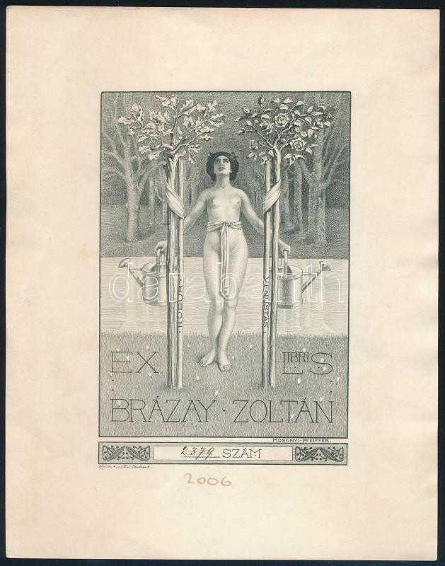 Mosonyi-Pfeiffer, Hellmann (1863-1905): Ex libris Brázay Zoltán (szecessziós könyvjegy). Acélmetszet, papír, jelzett a dúcon, lap alján tollas feliratokkal, 12×8 cm