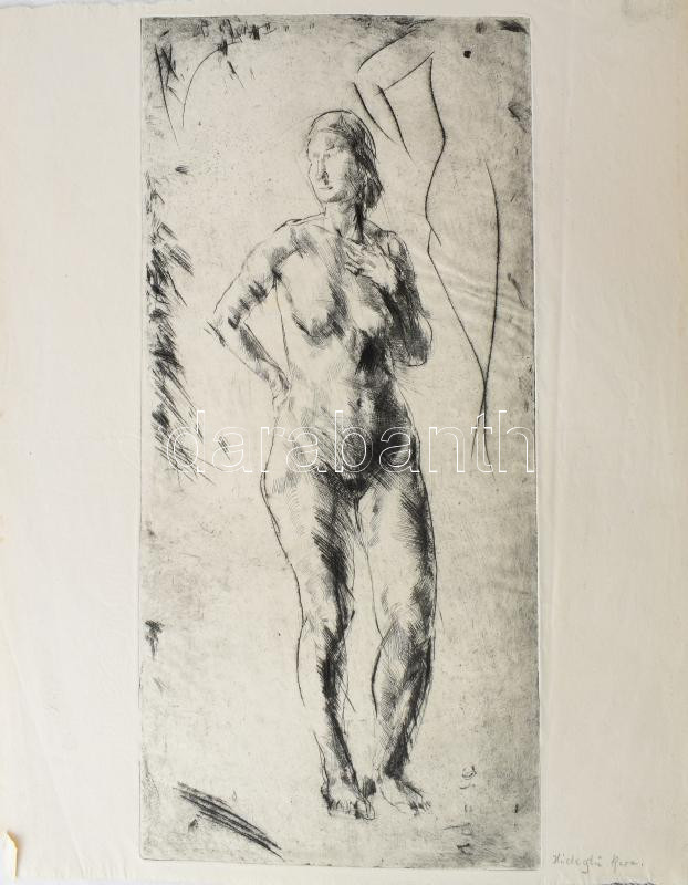 Aszódi Weil Erzsébet (1901-1976): Álló női akt (cím nélkül). Hidegtű, papír, jelzés nélkül, lap alján Aszódi Weil Erzsébet autográf feliratával ("hidegtű karc"). Ritka! 43×20 cm