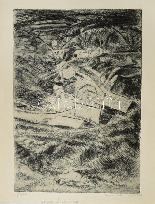 Aszódi Weil Erzsébet (1901-1976): Expresszív táj (cím nélkül). Rézkarc, papír, jelzett, próbanyomat "1 próba" jelzéssel, lap alján Aszódi Weil Erzsébet autográf feliratával ("lemez nincs meg"), lapszéli apró sérüléssel. Ritka! 36×25 cm