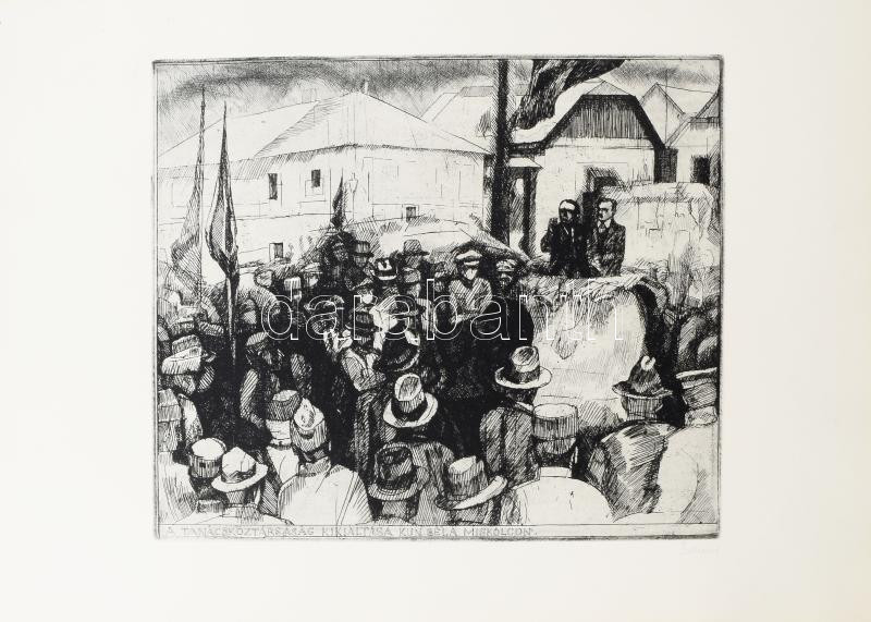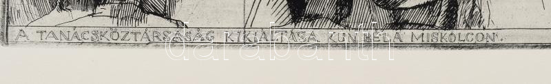 Beschreibung: Barczi Pál (1933-2003): A Tanácsköztársaság kikiáltása, Kun Béla Miskolcon. Rézkarc, papír, jelzett, 29×35 cm