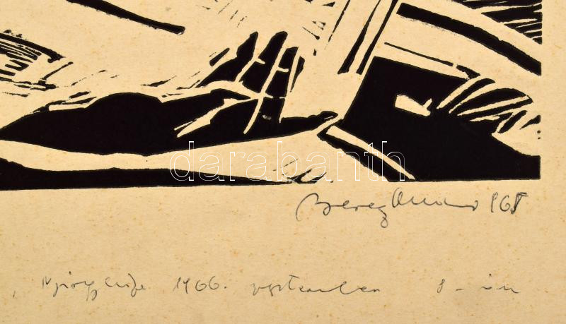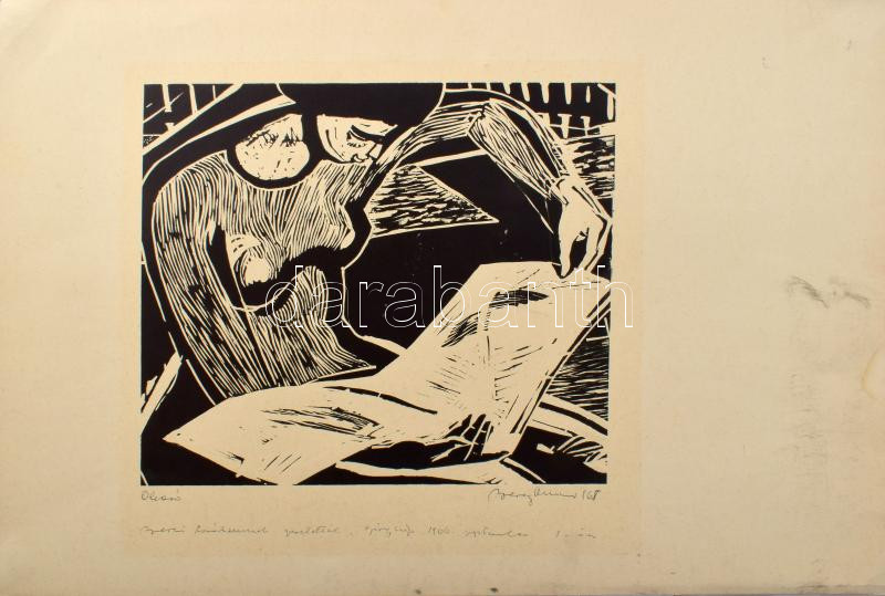 Berecz András (1929-2010): Olvasó, 1968. Linómetszet, papír, jelzett, a művész ajánlásával Soltész Albert festőművész részére, lapszéli kisebb ázásnyommal, 20,5×23 cm