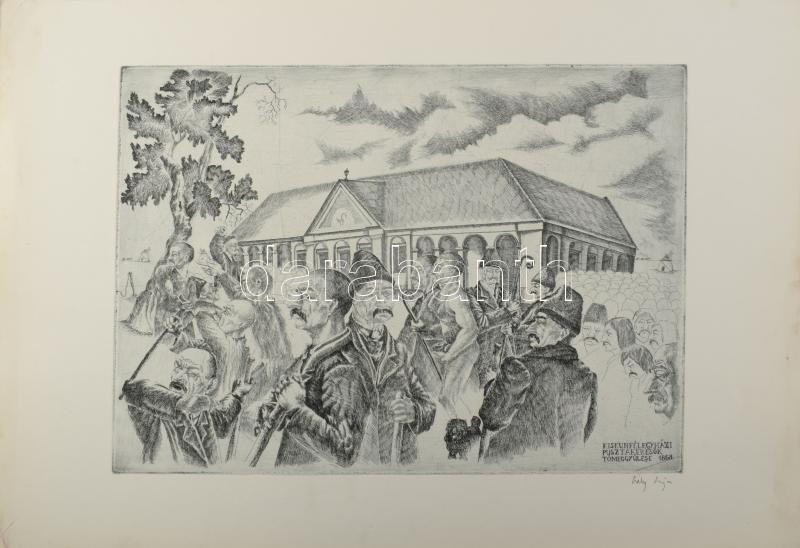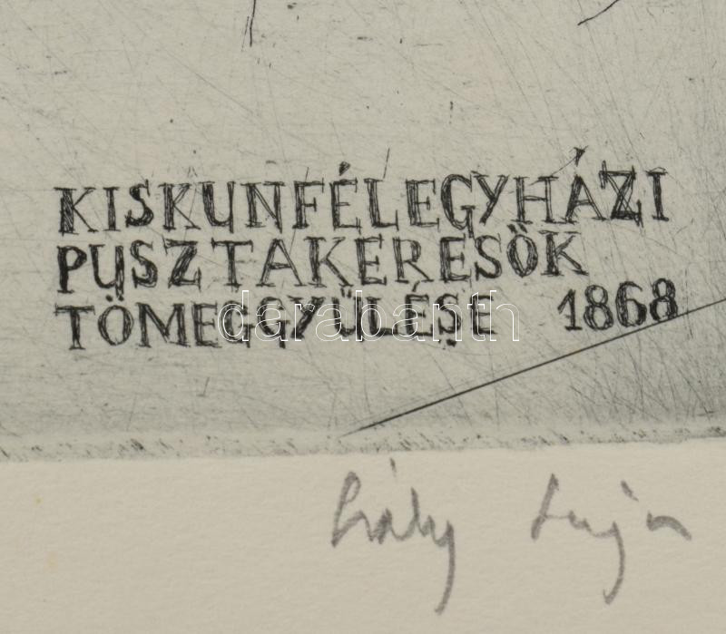 Beschreibung: Csáky Lajos (1950-): Kiskunfélegyházi pusztakerülők tömeggyűlése, 1868. Rézkarc, papír, jelzett, 29x39,5 cm
