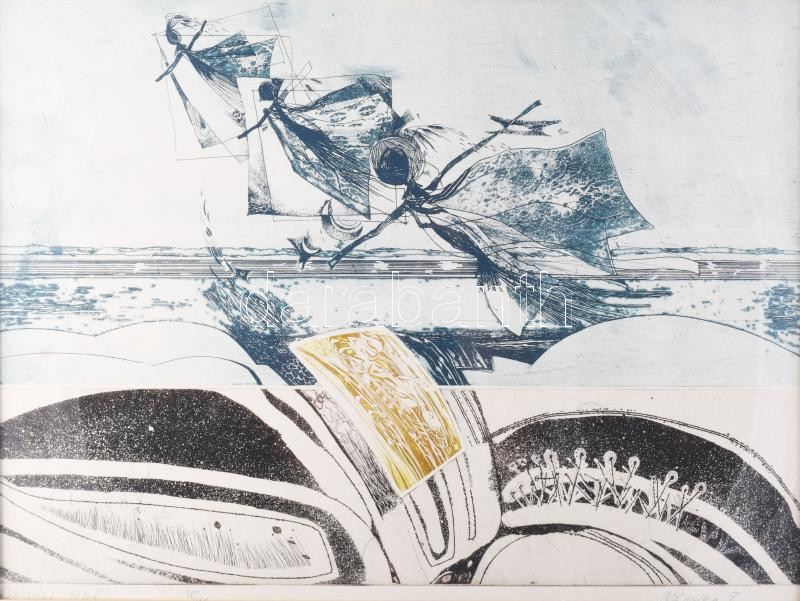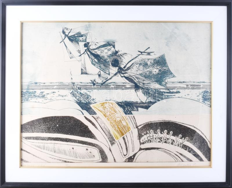 Beschreibung: Czinke Ferenc (1926-2000): Búcsúzó Villő. Színes rézkarc, papír, jelzett, számozott (25/100). Üvegezett, dekoratív fakeretben, 41,5×56,5 cm
