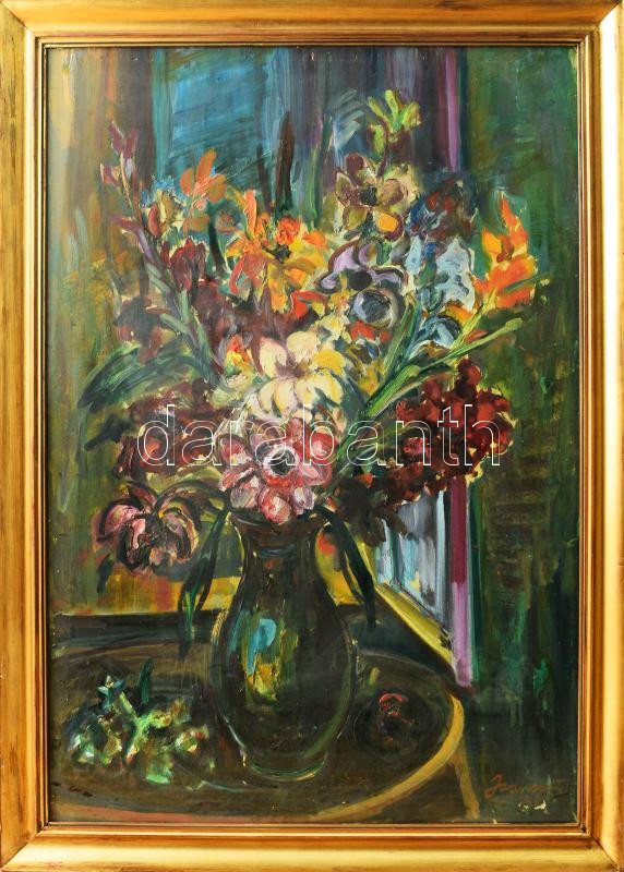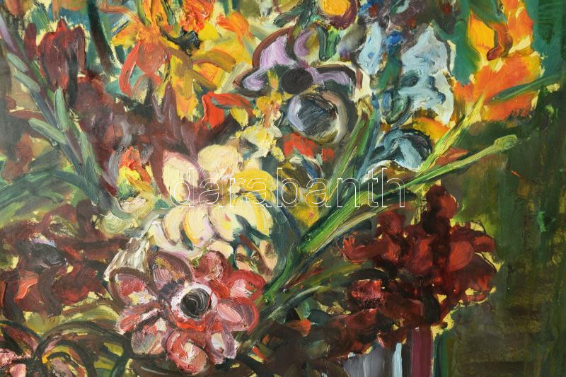 Joanovits István (1912-1995): Kardvirágok. Olaj, karton. Jelzett. Hátoldalán Képcsarnok Vállalat címkéivel, mely szerint kiállítva a Szinyei Merse Teremben. Dekoratív, üvegezett fakeretben. 100×70 cm