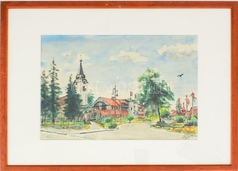 Beschreibung: Kovács Ernő (-): Veresegyháza, 2017. Tus, akvarell, papír, jelezve jobbra lent. Üvegezett fakeretben. 20x28 cm