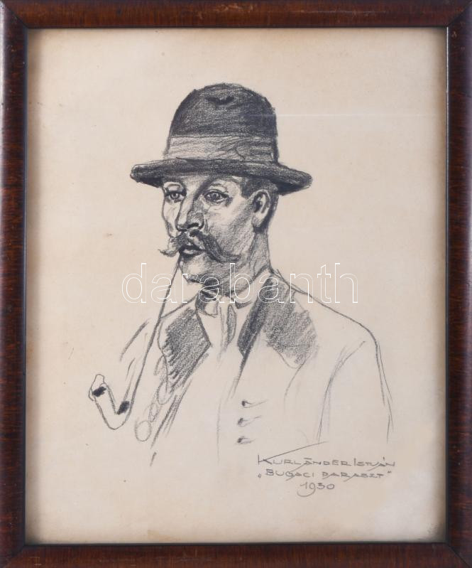 Kurländer István (-), működött a XX. sz. első felében: Bugaci paraszt, 1931. Ceruza, papír, jelzett, hátoldalán Kurländer István autográf feliratával, üvegezett fakeretben, 26,5×22 cm