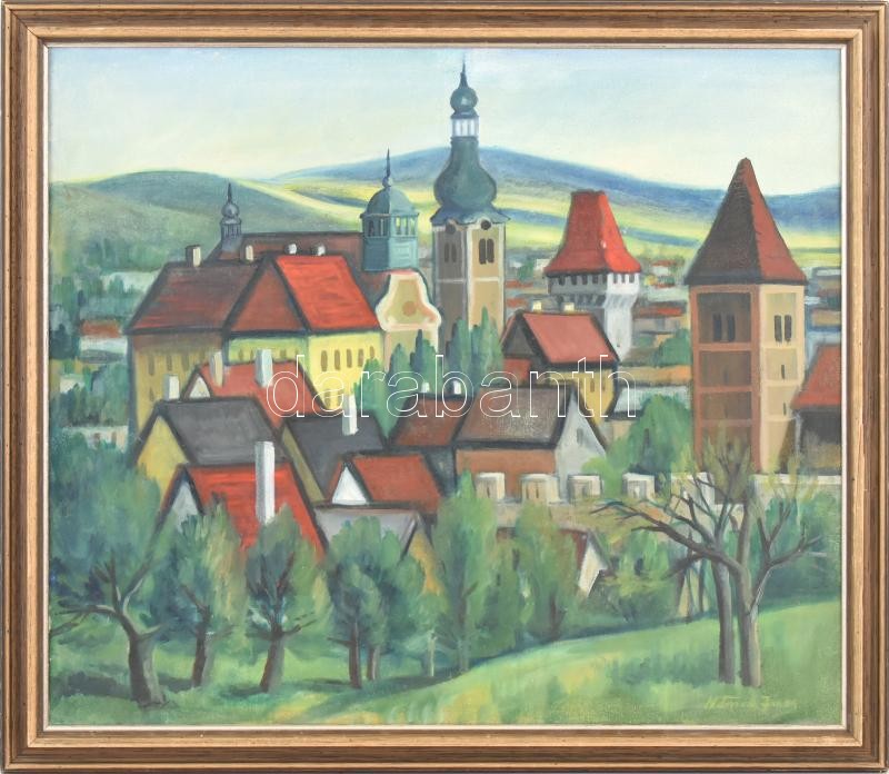 Németh János (1937-): Kőszeg látképe. Olaj, vászon, jelzett. Fa keretben, 60x80cm / János Németh (1937-): Panorama of Kőszeg (Güns). Oil on canvas, signed. Framed, 60x80cm