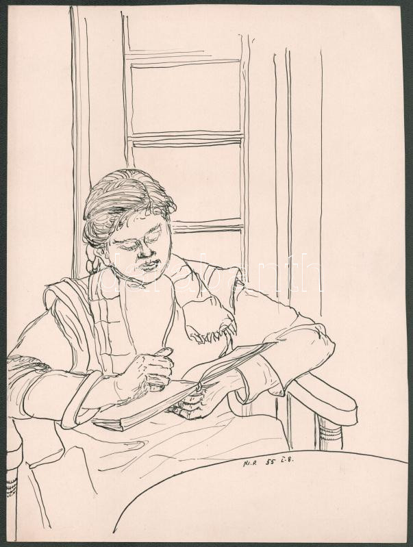 Beschreibung: Nolipa István Pál (1907-1986): Irmuska tanul (a festő lánya), 1955. Tus, karton. Jelzett. 30x22 cm