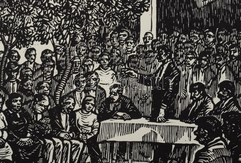 Beschreibung: Palkó József (1919-2004): Az SZDP kiskunfélegyházi székházának felavatása, 1929. Linómetszet, papír, jelzett, 30×40 cm