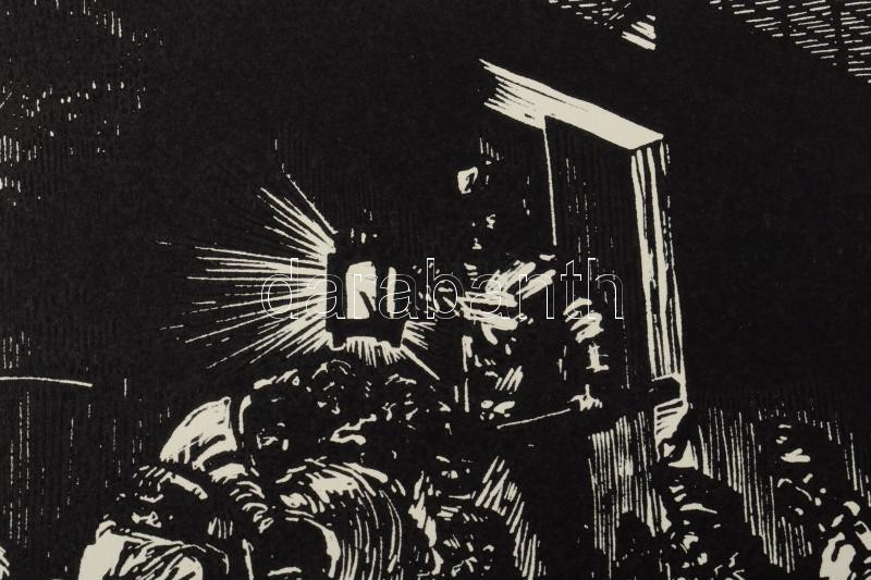 Beschreibung: Palkó József (1919-2004): Héjjas Iván különítményének behatolása a kecskeméti fogházba, 1919. nov. 20. Linómetszet, papír, jelzett, 30×40 cm