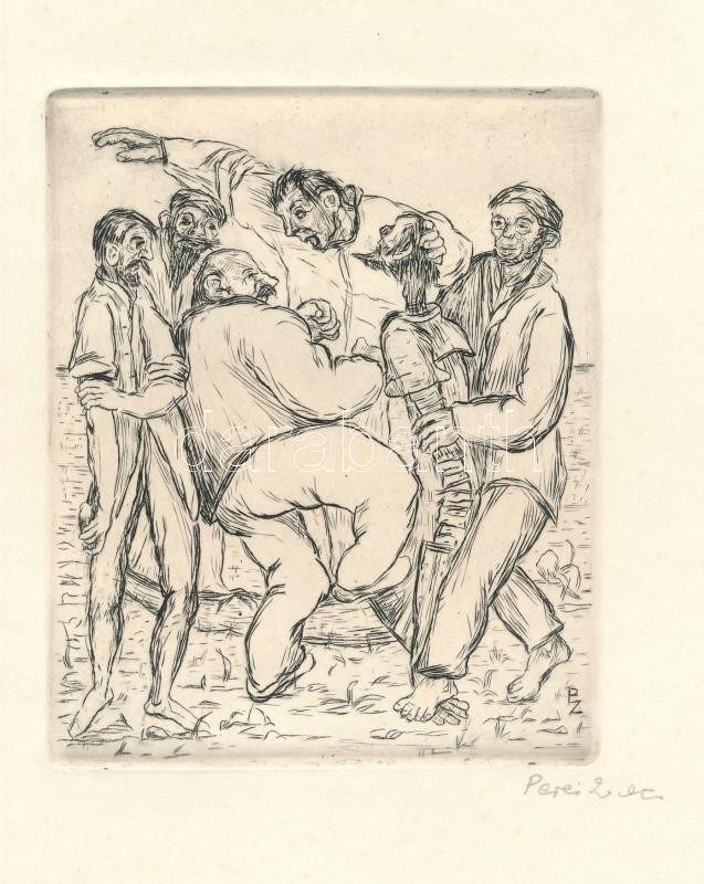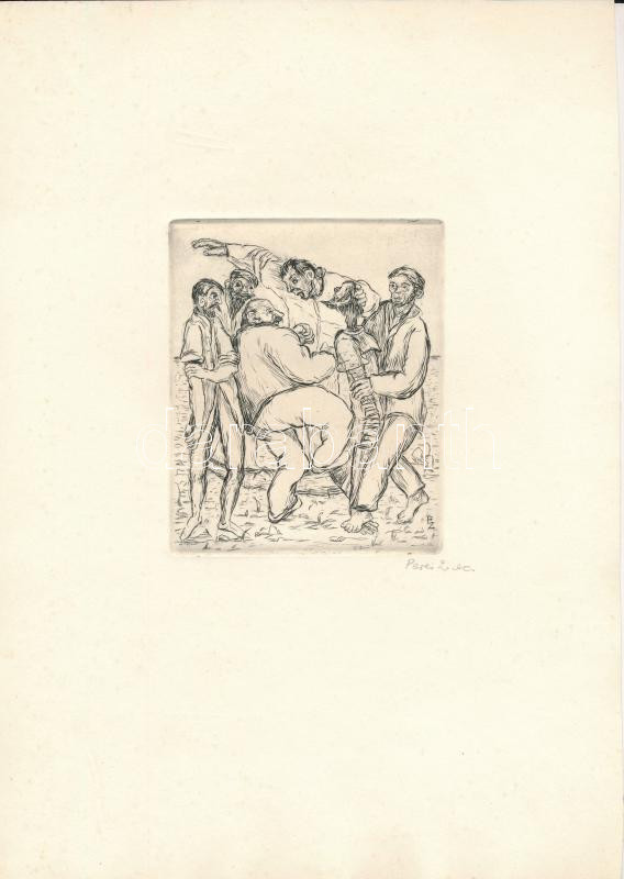 Perei Zoltán (1913-1992): Öszvérhajcsárokkal viaskodik (Don Quijote illusztráció), 1949. Rézmetszet, papír, jelzett. Az 1949-ben megjelent Don Quijote de la Mancha élete c. mappából. 11,5x9 cm. Ritka!