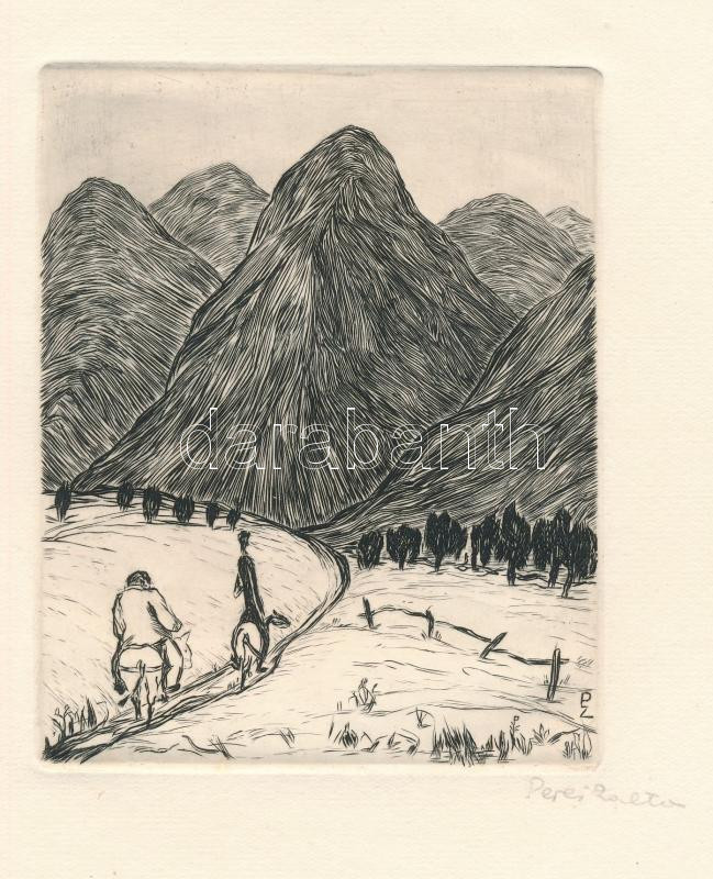 Perei Zoltán (1913-1992): Útban a Fekete-hegység felé (Don Quijote illusztráció), 1949. Rézmetszet, papír, jelzett. Az 1949-ben megjelent Don Quijote de la Mancha élete c. mappából. 11,5x9 cm. Apró lapszéli folttal. Ritka!