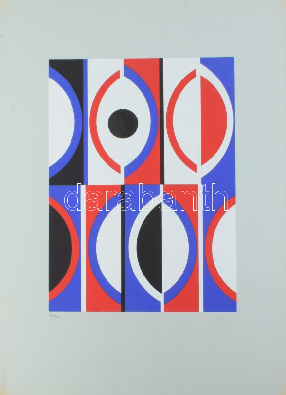 Beschreibung: Schöffer, Nicolas (Miklós) (1912-1992): Geometrikus kompozÃció (cÃm nélkül). Szitanyomat, papÃr, jelzett, számozott (40/120). Az 1987-ben megjelent Nicholas Schöffer Varigráfiai c. mappából. Lap sarkaiban apró elszÃnezÅ‘désekkel. 44×32 cm