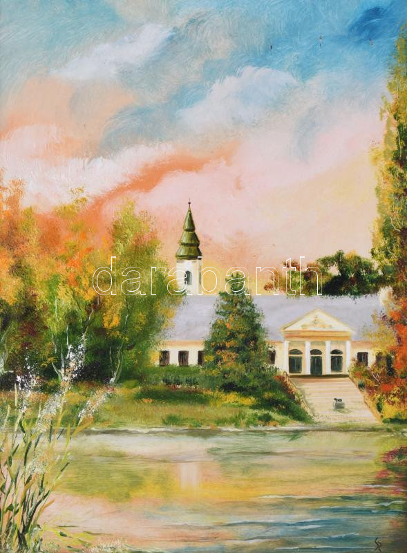 Beschreibung: Szabó László (-): A szarvasi Bolza-kastély. Olaj, farost, jelzett. Dekoratív fakeretben, 40×30 cm
