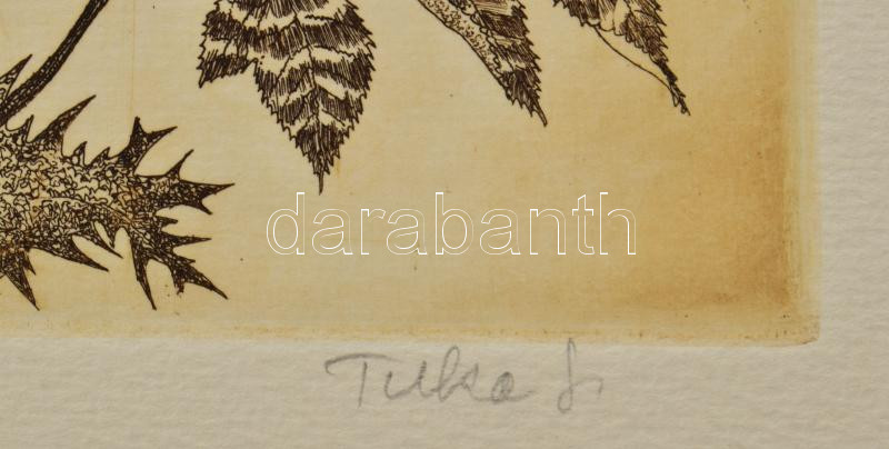 Beschreibung: Tuka László (1924-2007): Bogáncs. Színes rézkarc, papír, jelzett, számozott (12/15). 39x25,5 cm