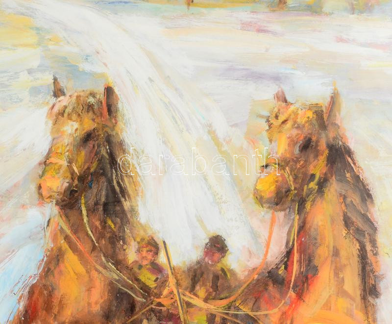 Beschreibung: Váczi Lajos (XX. sz. második fele): Lovasszán. Olaj, farost, jelzett, üvegezett fakeretben, 84x60 cm
