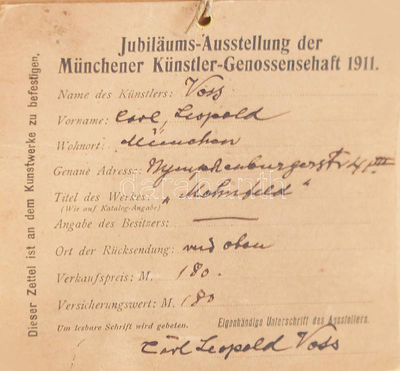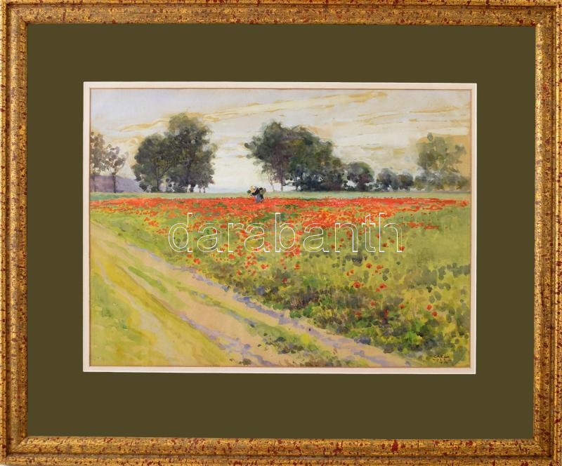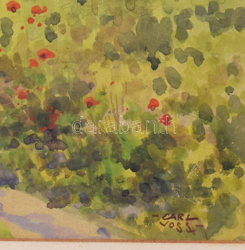 Voss, Carl Leopold (1856-1921): Pipacsmező (Mohnfeld). Akvarell, papír, jelzett, hátoldalán a )Műncheni Művészegylet 1911-ben rendezett jubileumi kiállítási címkéjével (Jubiläums-Ausstellung der Münchener Künstler-Genossenschaft) és rajta a művész autográf aláírásával, üvegezett fakeretben, 30,5x41,5 cm / Voss, Carl Leopold (1856-1921), German painter: Mohnfeld. Watercolour on paper, signed, with autograph signature of the artist on exhibition label (Jubiläums-Ausstellung der Münchener Künstler-Genossenschaft 1911) on the reverse. Framed