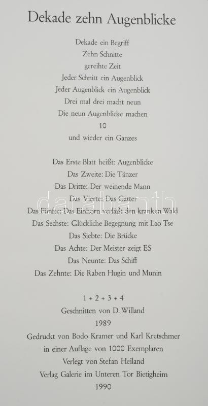 Willand, Detlef (1935-2022): Évtized, tÃz pillanat (Dekade, zehn Augenblicke). 10 db fametszet, papÃr, jelzés nélkül. Galerie im Unteren Tor, Bietigheim kiadása. Kiadói paÃprborÃtóba, kÃsérÅ‘szöveggel. 52,5×50 cm