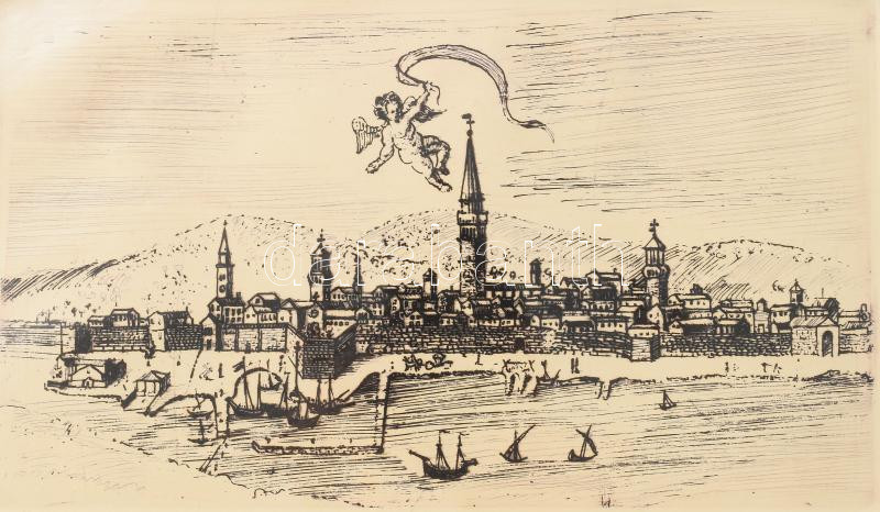 Beschreibung: Jelzés nélkül: Angyal a város felett. Rézkarc, papír. 14x23,5 cm.