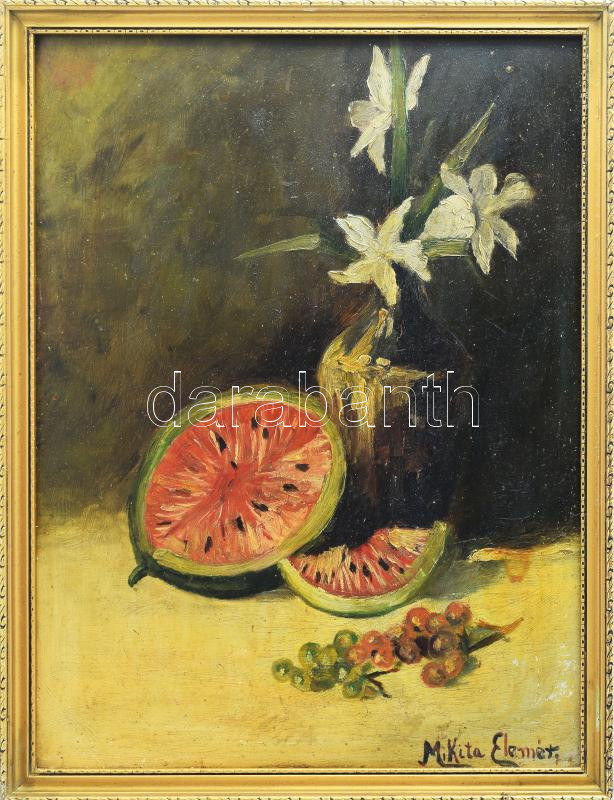 Mikita Elemér (XX. sz. első fele): Csendélet dinnyévek. Olaj, karton. Jelzett. Fakeretben. 39x29,5 cm