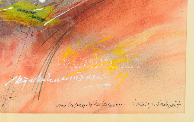 Beschreibung: Olvashatatlan jelzéssel: Gesztusok. Vegyes technika, papír. Üvegezett fakeretben. 30×50 cm