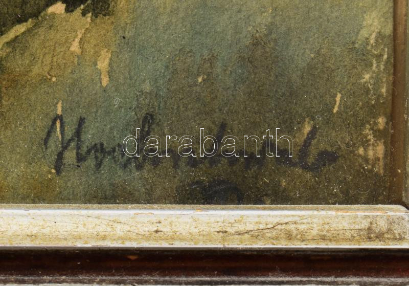Beschreibung: Olvashatatlan jelzéssel: Hegyvidéki táj. Akvarell, papír. 24,5x17,5 cm, üvegezett fakeretben.