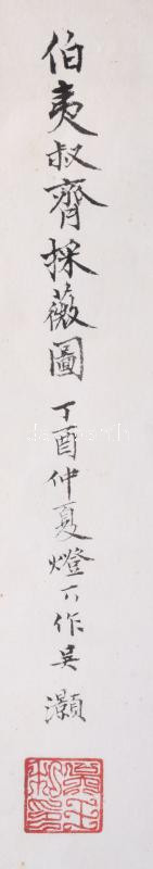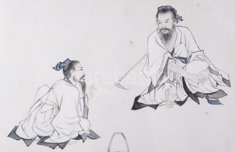 Olvashatatlan jelzéssel, kínai alkotó, XX. sz. közepe: Beszélgetés. Akvarell, selyem. Néhány apró folttal. Üvegezett fakeretben. 30×40 cm