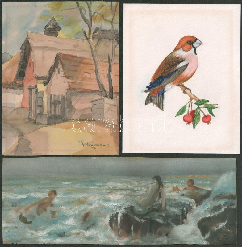 Olvashatatlan jelzéssel vagy jelzés nélkül, klf. alkotók, 3 db mű: Fürdőzők, utcarészlet és madár. Klf. technikák, papír. 17,5x14, 18x14 és 10x28 cm