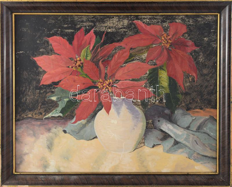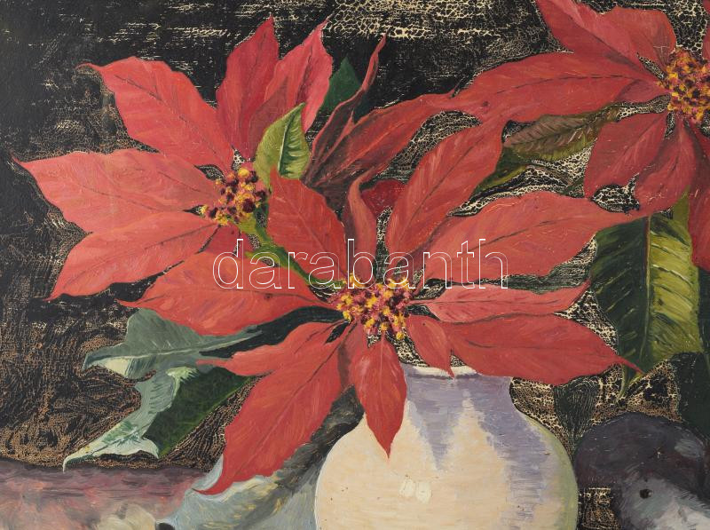 Beschreibung: Schwarz L jelzéssel: Virág. Olaj, farost. Dekoratív, kissé sérült fakeretben. 40x50 cm