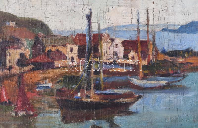 Beschreibung: Tibor Ernő jelzéssel: Kikötő vitorlásokkal. Olaj, karton. Kissé sérült. Dekoratív fakeretben. 30×42,5 cm