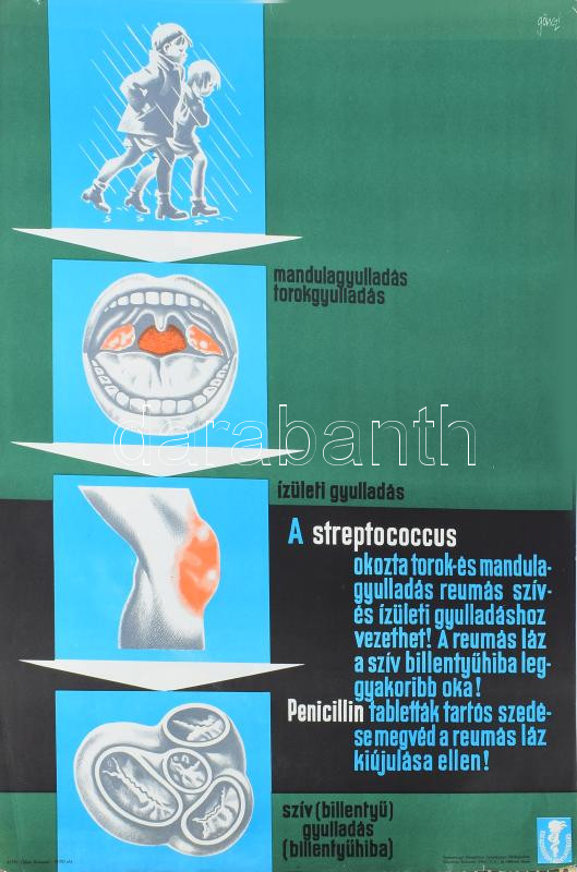1964 Gönczi-Gebhardt Tibor (1902-1994): Mandulagyulladás, torokgyulladás, ízületi gyulladás. Egészségügyi felvilágosító plakát, kis lapszéli szakadással, gyűrődéssel, 68x47 cm
