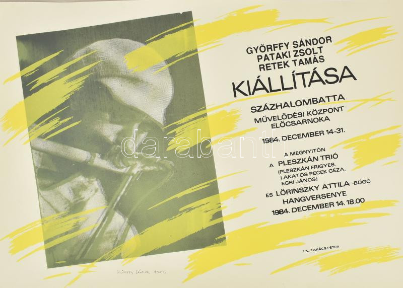 Győrffy Sándor (1951-): Győrffy Sándor, Pataki Zsolt, Retek Tamás kiállítása, Százhalombatta, 1984. Plakát, szitanyomat, papír, Győrffy Sándor által ceruzával jelzett, 49x68 cm. Rendkívül ritka plakát, a kiállításon jazz koncerteken készült fotók szerepeltek, a bal oldalán Egberto Gismonti zenész látható!