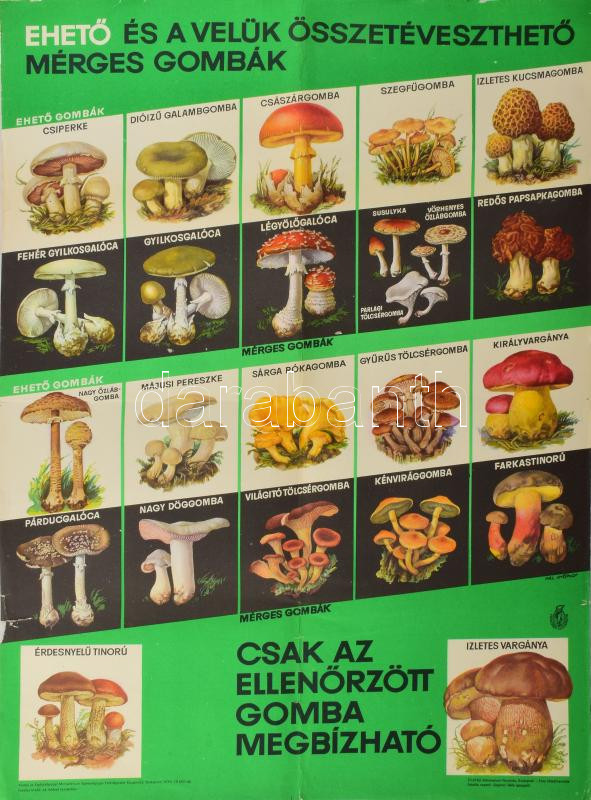 Pál György (1906-1986): EhetÅ‘ és a velük összetéveszthetÅ‘ mérges gombák, 1970. Egészségügyi felvilágosÃtó plakát, papÃr, jelzett a plakáton, Athenaeum Nyomda, hajtásnyommal, lapszéli kisebb sérülésekkel, 69x47,5 cm