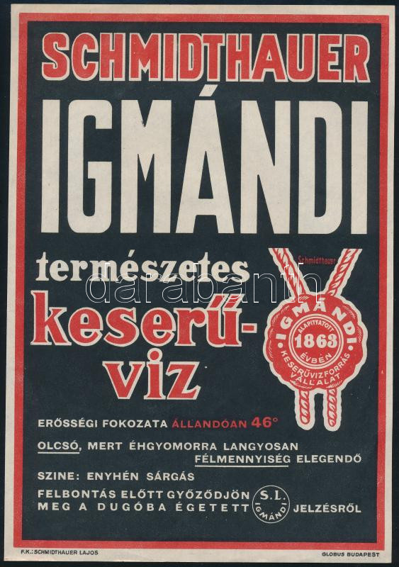 Schmidthauer Igmándi természetes keserűvíz kisplakát, 24×17 cm https://www.darabanth.com/de/509-Fernauktion/509.0/Gemalde-und-Grafiken/Plakat~3/Schmidthauer-Igmandi-termeszetes-keseruviz-kisplakat-24C39717-cm~II3449744