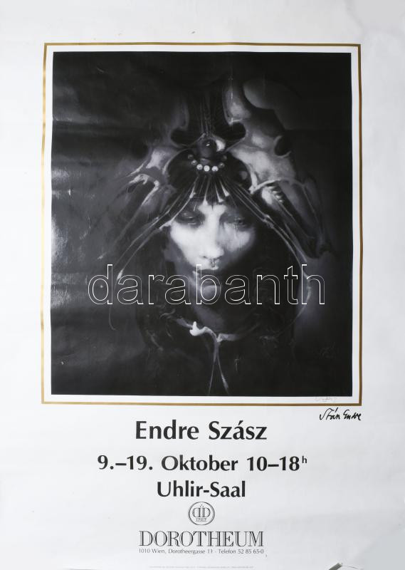 Szász Endre (1926-2003): Női arc. Dorotheum kiállítási plakát, ofszet, papír, Szász Endre 2 db autográf aláírásával, lapszéli kisebb szakadással, hajtásnyomokkal, feltekerve, 84x59 cm