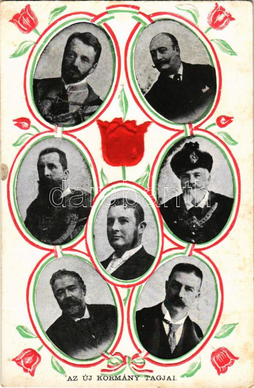 Az új (második) Wekerle-kormány tagjai: Wekerle Sándor, Ifj. Andrássy Gyula, Polónyi Géza, Kossuth Ferenc, Apponyi Albert, Josipovich Géza, Zichy Aladár. tulipános, hazafias dombornyomott selyemlap / Hungarian Goverment of 1906. Embossed, patriotic tulips, silk card (lyuk / pinhole)