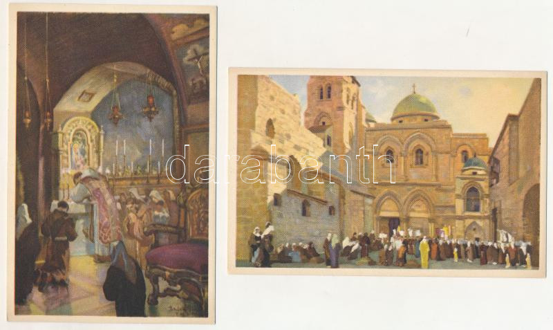 Beschreibung: 21 db RÉGI Hollós Endre vallásos művészlap. Kiadja A Szentföld biztosi hivatala / 21 pre-1945 religious art postcards signed by Endre Hollós