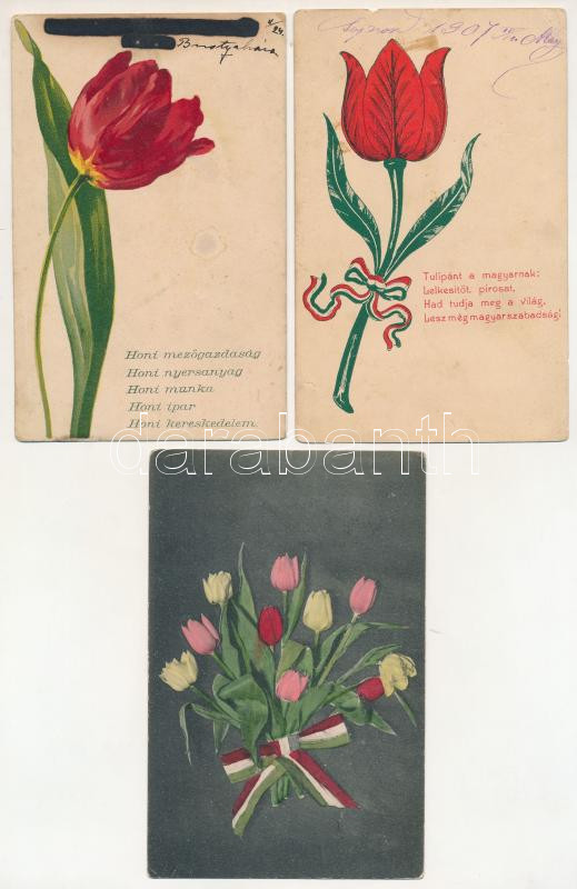 Beschreibung: 3 db RÉGI tulipános patrióta propaganda képeslap / 3 pre-1945 Hungarian patriotic propaganda postcard with tulips