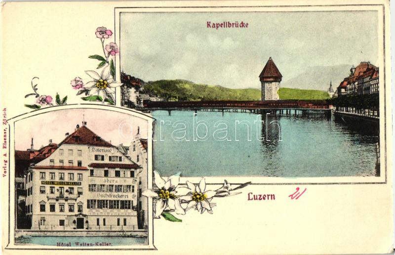 Lucerne, Luzern; Kapellbrücke / chapel-bridge, Hotel Weiten Keller, fl... https://www.darabanth.com/de/510-Fernauktion/510.0/Ansichtskarten/Schweiz~543/Lucerne-Luzern-Kapellbrucke-chapel-bridge-Hotel-Weiten-Keller-floral-EK~II1315984