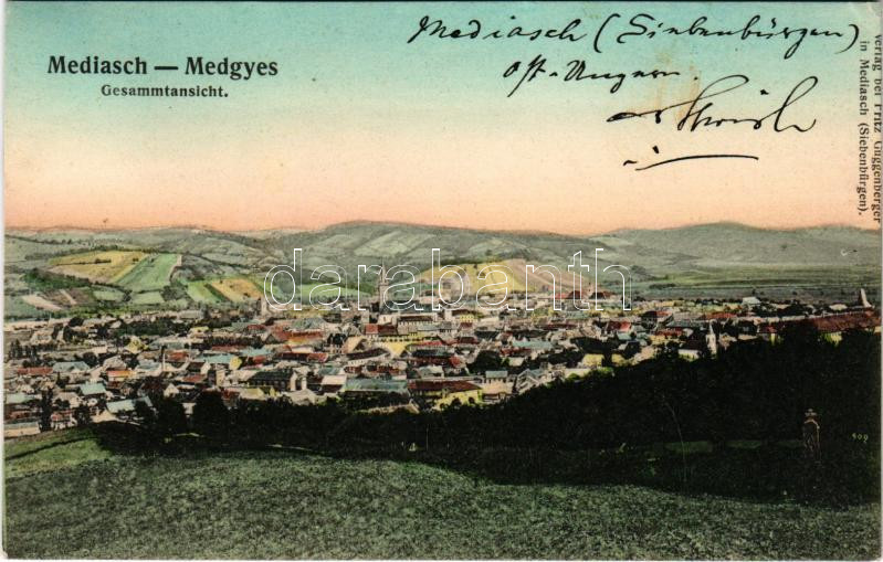 Beschreibung: Medgyes, Mediasch, Medias; Gesamtansicht / látkép. Fritz Guggenberger kiadása / general view (EK)