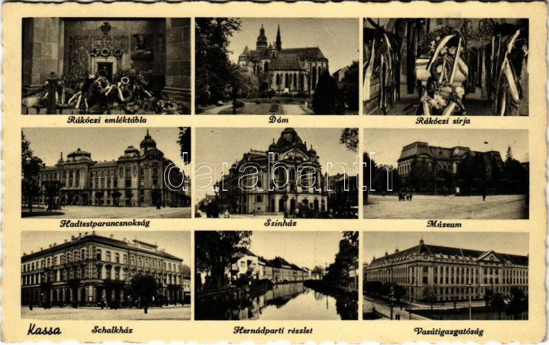 1939 Kassa, Kosice; Rákóczi emléktábla, Dóm, Rákóczi sírja, Hadtestparancsnokság, Színház, Múzeum, Schalk-ház, Hernád-parti részlet, Vasútigazgatóság / crypt and monument of Francis II Rákóczi, cathedral, army headquarters, theatre, museum, Hornád riverside, railway directorate
